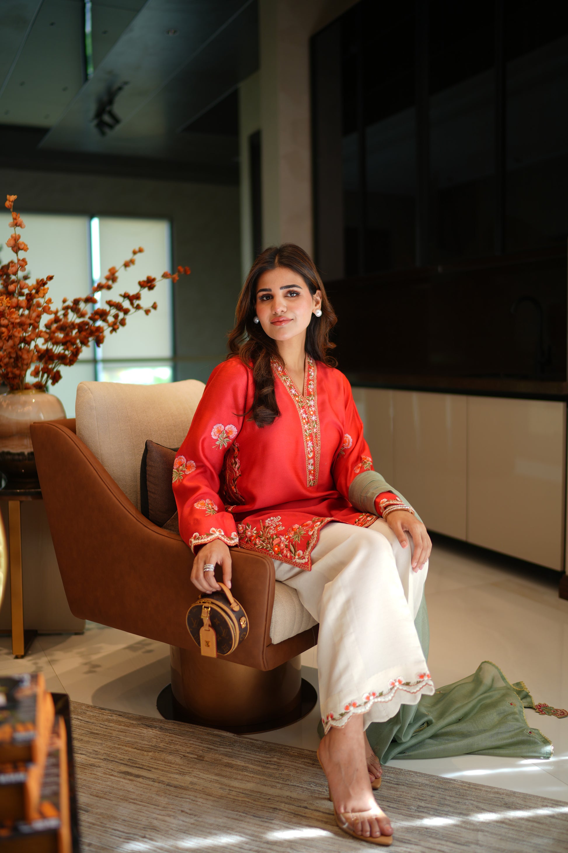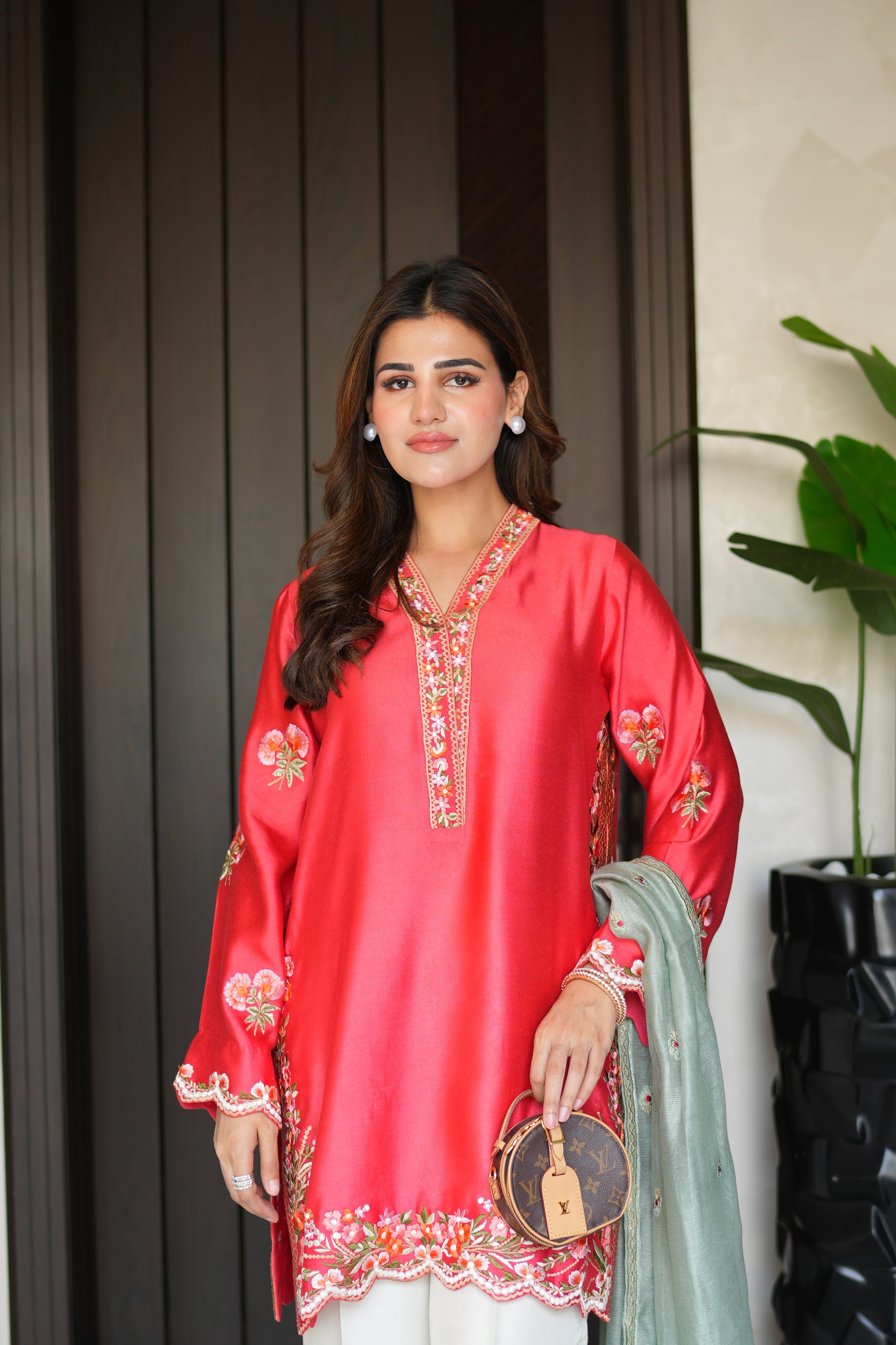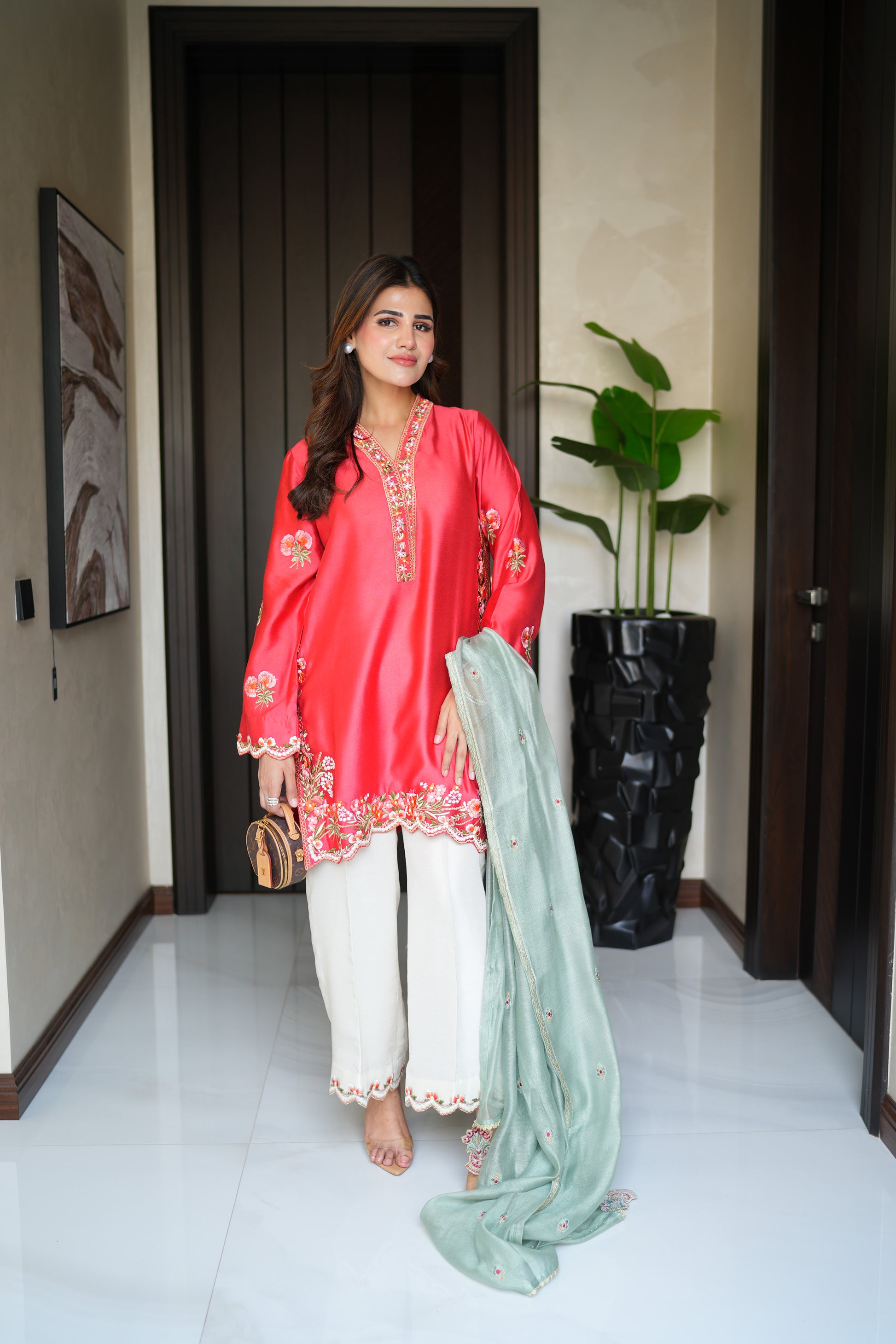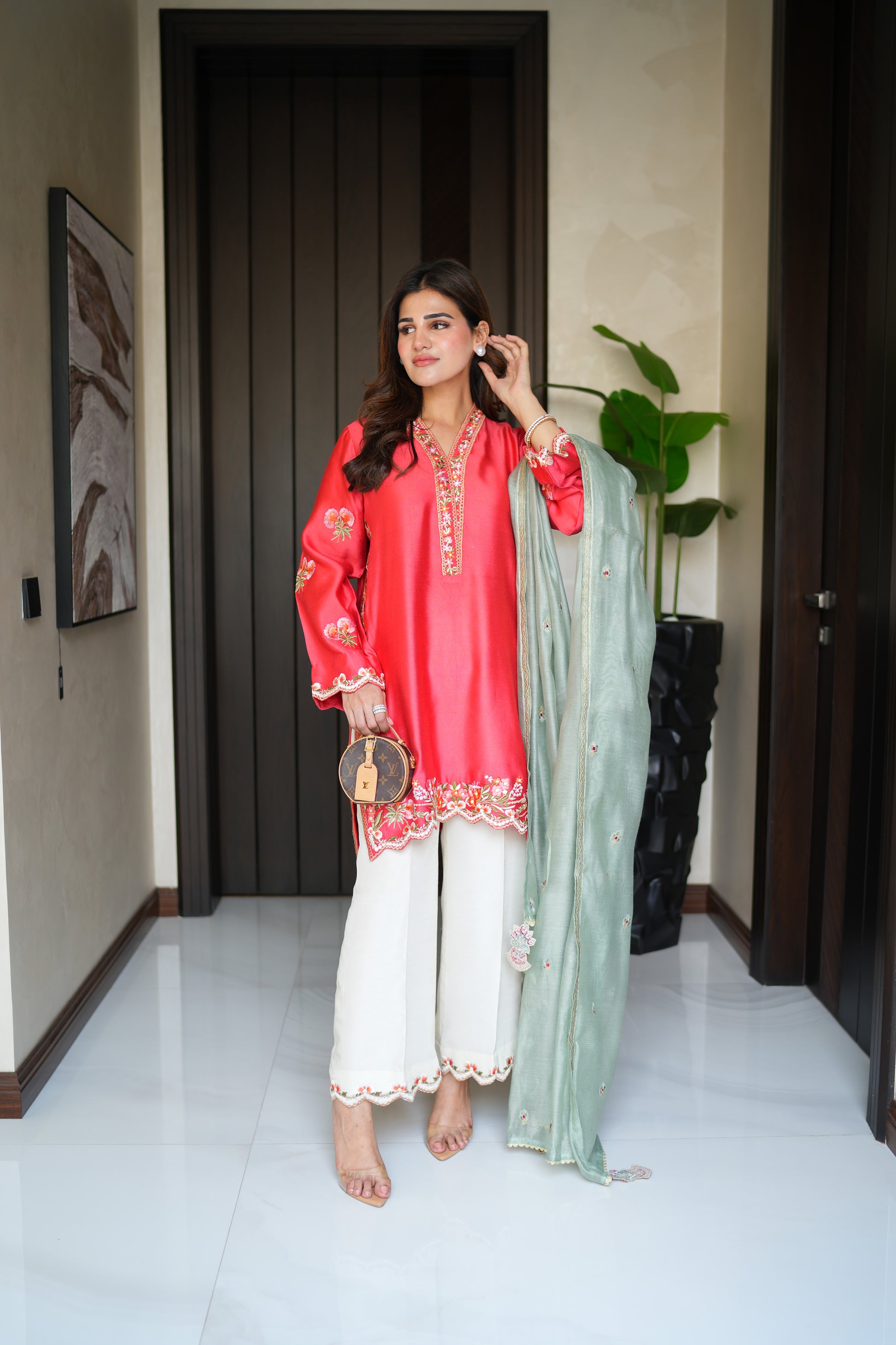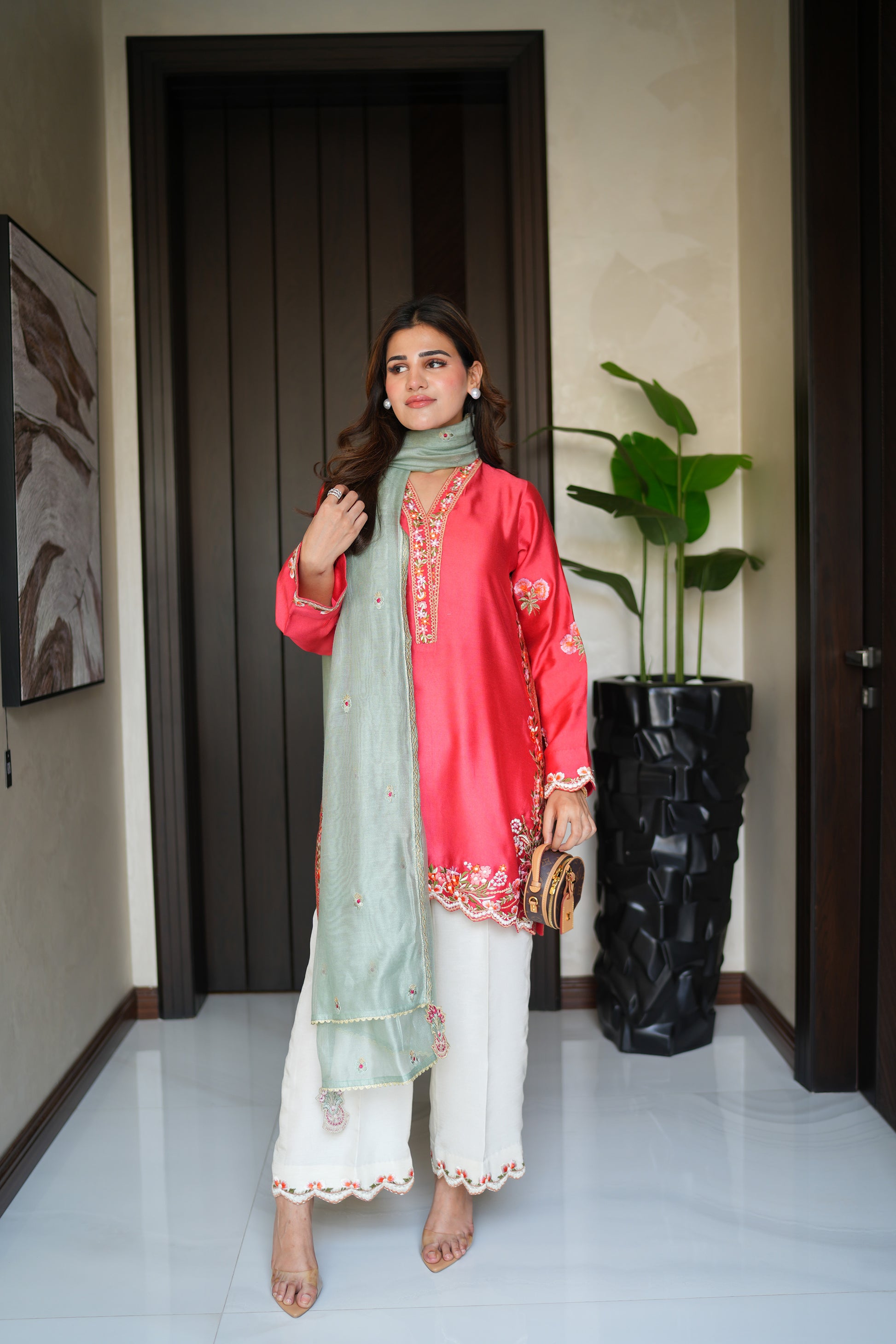 Step into summer with style in this cotton net shirt in coral with a detailed embroidery, crème colored embroidered trousers and a mint green dupatta with embroidered edges and tassels